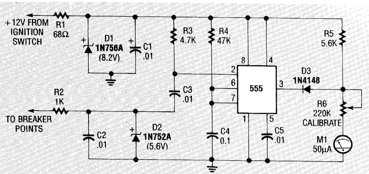 Este circuito es de una Electronics Now, americana de diciembre de 1992. La revista ya no existe, pero el circuito se puede montar fácilmente, ya que todos los componentes son comunes. El circuito indica la rotación de motores de automóviles antiguos, que todavía utilizan platinado, ya que utiliza los pulsos generados por este componente para la medida de la RPM.