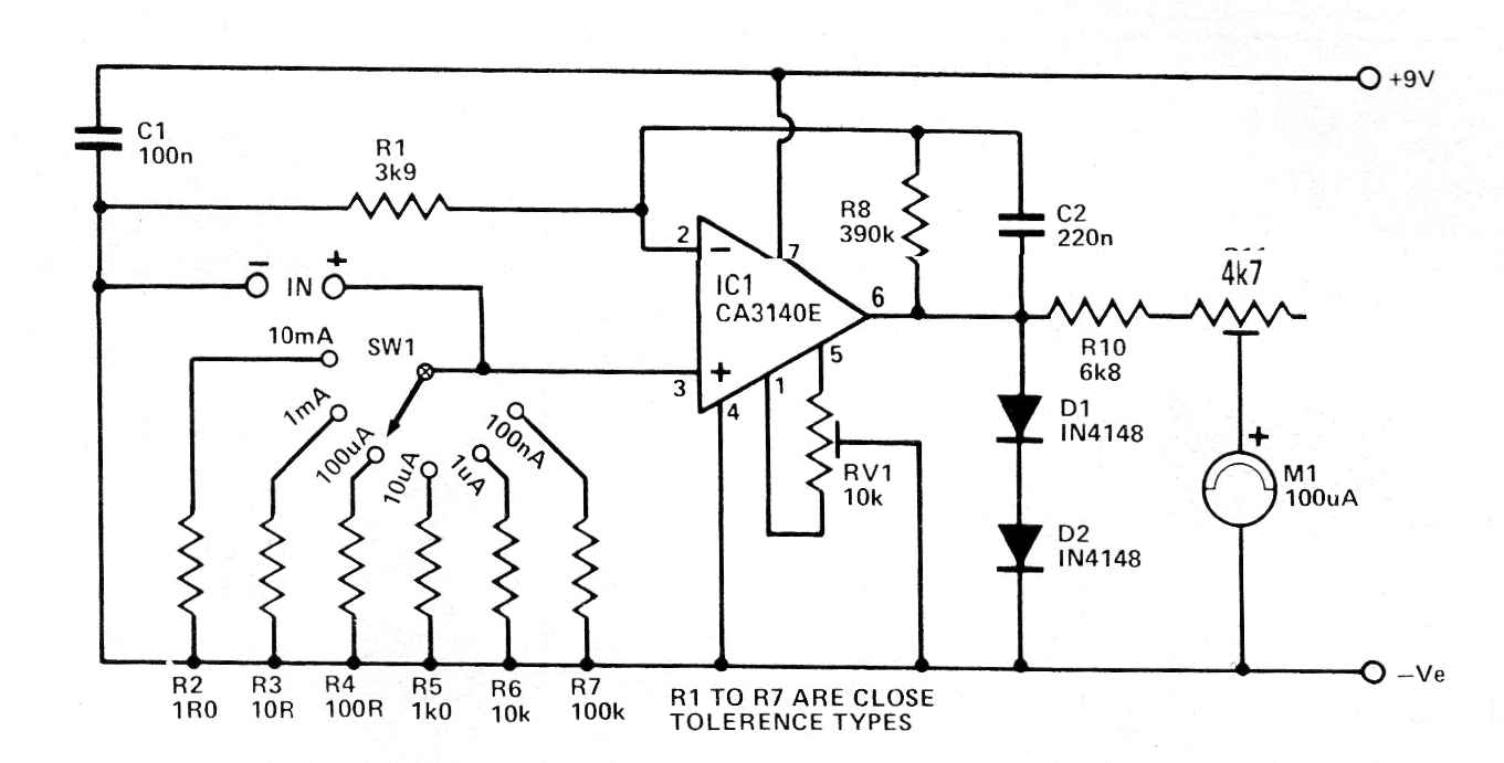 Este circuito fue obtenido en una revista inglesa de 1979. Este circuito tiene por objetivo medir corrientes muy débiles a partir de algunos nanoampères en diversas escalas. La alimentación se puede realizar por batería de 9 V y en lugar del instrumento se puede utilizar la escala correspondiente de corrientes de un multímetro común. La precisión de las medidas depende de la precisión de los resistores utilizados.