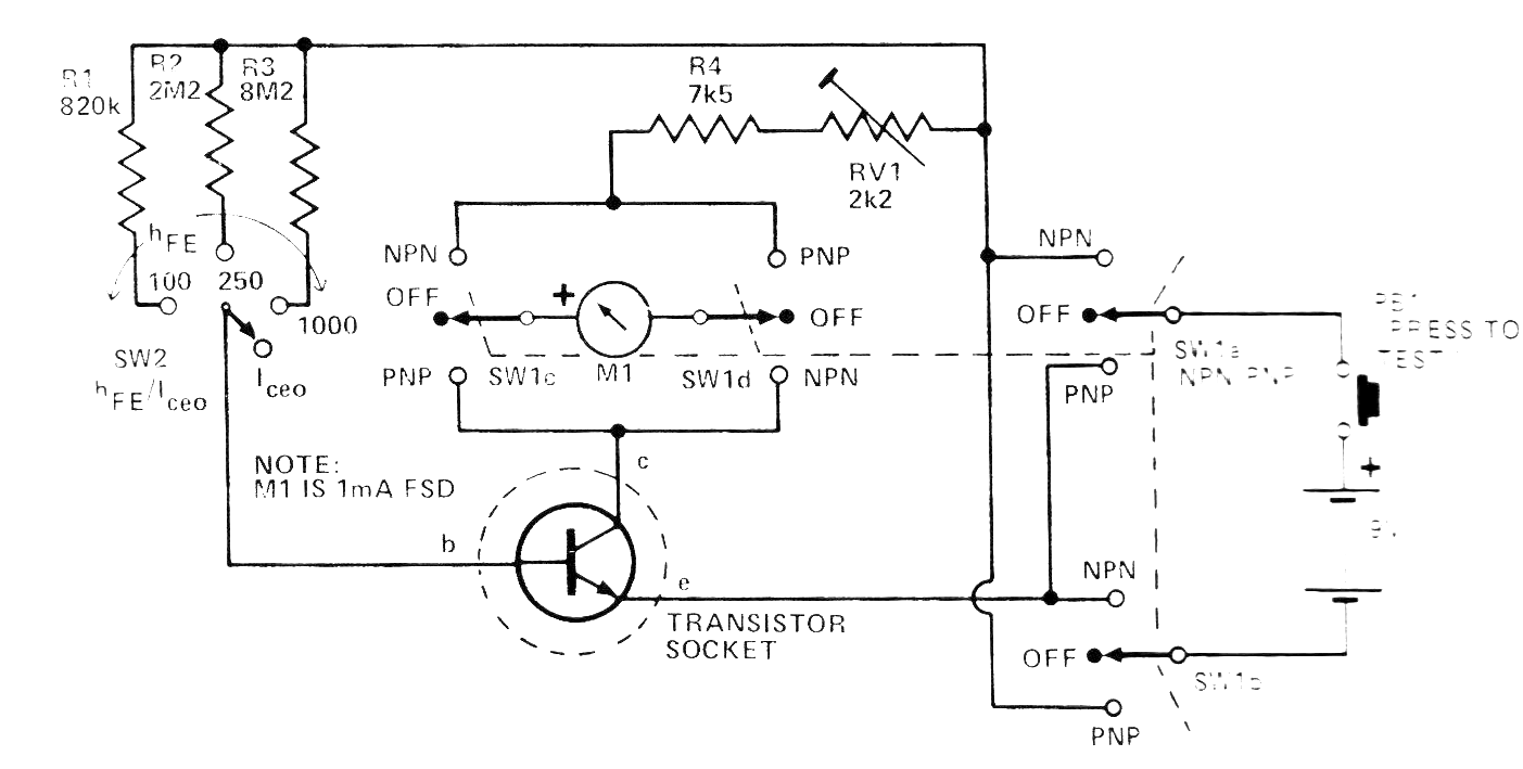 Este circuito fue obtenido en una revista inglesa de 1978. Este circuito es uno de los muchos que el lector puede encontrar en el banco de circuitos. Prueba transistores bipolares NPN y PNP comunes, proporcionando la indicación de estado en un medidor de corriente analógica, que puede ser sustituido por un multímetro común en la escala de corrientes. La alimentación se puede realizar con tensiones de 6 a 9 V.