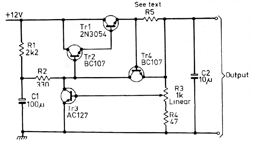 Este circuito fue obtenido en una revista inglesa de 1982. Se trata de un regulador para salidas entre 1 y 5 V, con corrientes del orden de 200 mA. El 2N3054 puede ser sustituido por un TIP31, los BC107 por BC548 y el AC127 no es recomendable cambiar, pero si necesita utilizar un transistor NPN de germanio.