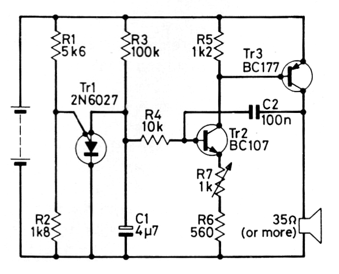 Este circuito fue obtenido en una revista inglesa de 1982. Se trata de un oscilador con Transistor programable Unijuntura, indicado para sistemas de alarma y aviso. El transistor NPN puede ser el BC548 y el PNP el BC558. La alimentación se puede realizar con tensiones de 9 a 12 V. Para tensiones mayores, utilice un BD136 para Tr3.