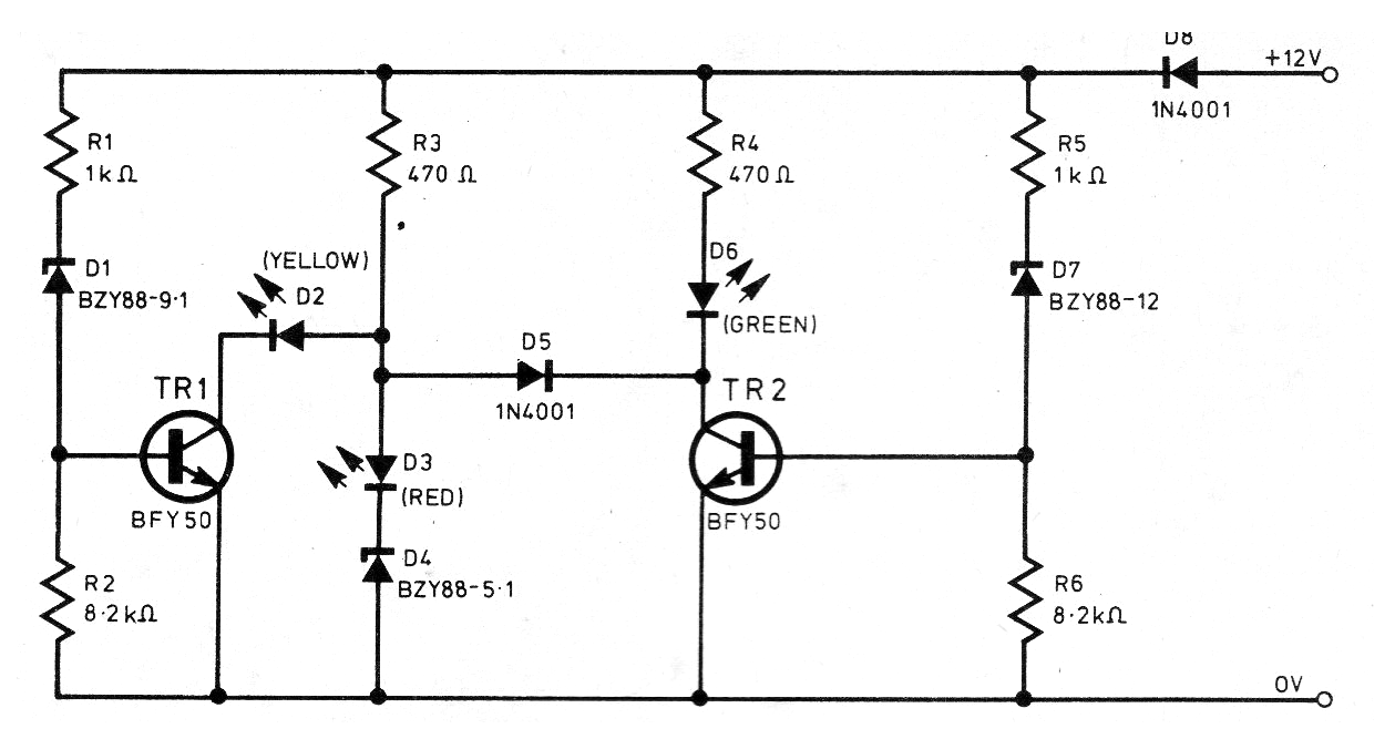 Este circuito fue encontrado en una revista inglesa de 1978. Se trata de una configuración bastante tradicional para indicar el estado de una batería de coche a través de 3 LED. El circuito se puede montar con transistores BC548.