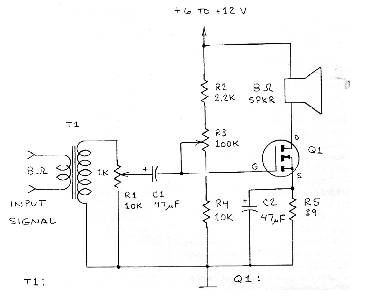 Este circuito fue obtenido en una revista americana Modern Electronics de 1990, pero todavía es actual y útil. Utiliza un MOSFET para aumentar una señal de audio de una salida de auriculares, un MP3, una radio u otro tipo de fuente de señal. El transformador se puede obtener en una radio transistor antigua fuera de uso y la alimentación debe realizarse con fuente de 6 a 12 V. El MOSFET de potencia puede ser prácticamente de cualquier tipo.