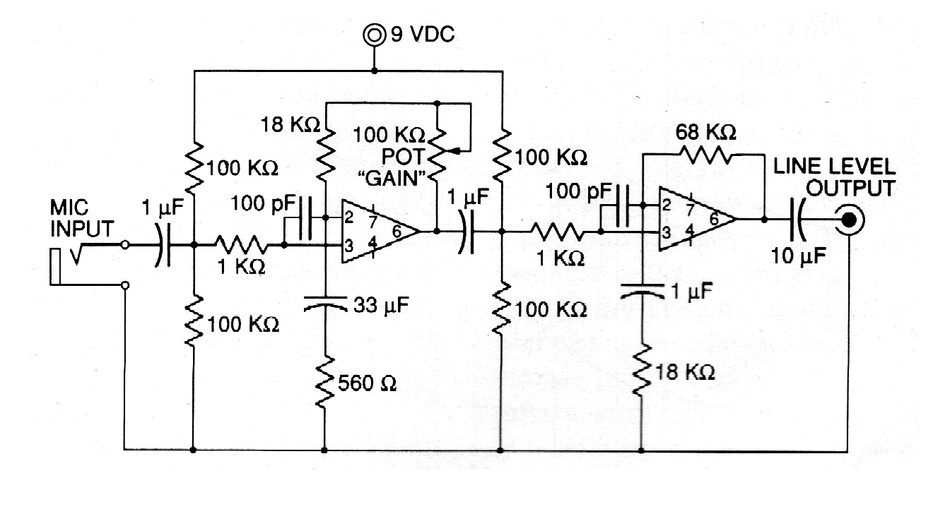 Este circuito fue obtenido en una revista Modern Electronics de 1990, pero todavía es actual y útil. Aumenta la intensidad de la señal de un micrófono de baja impedancia que permite su uso con amplificadores de baja sensibilidad. La alimentación de 9 V puede ser hecha por batería, ya que el consumo del circuito es muy bajo.