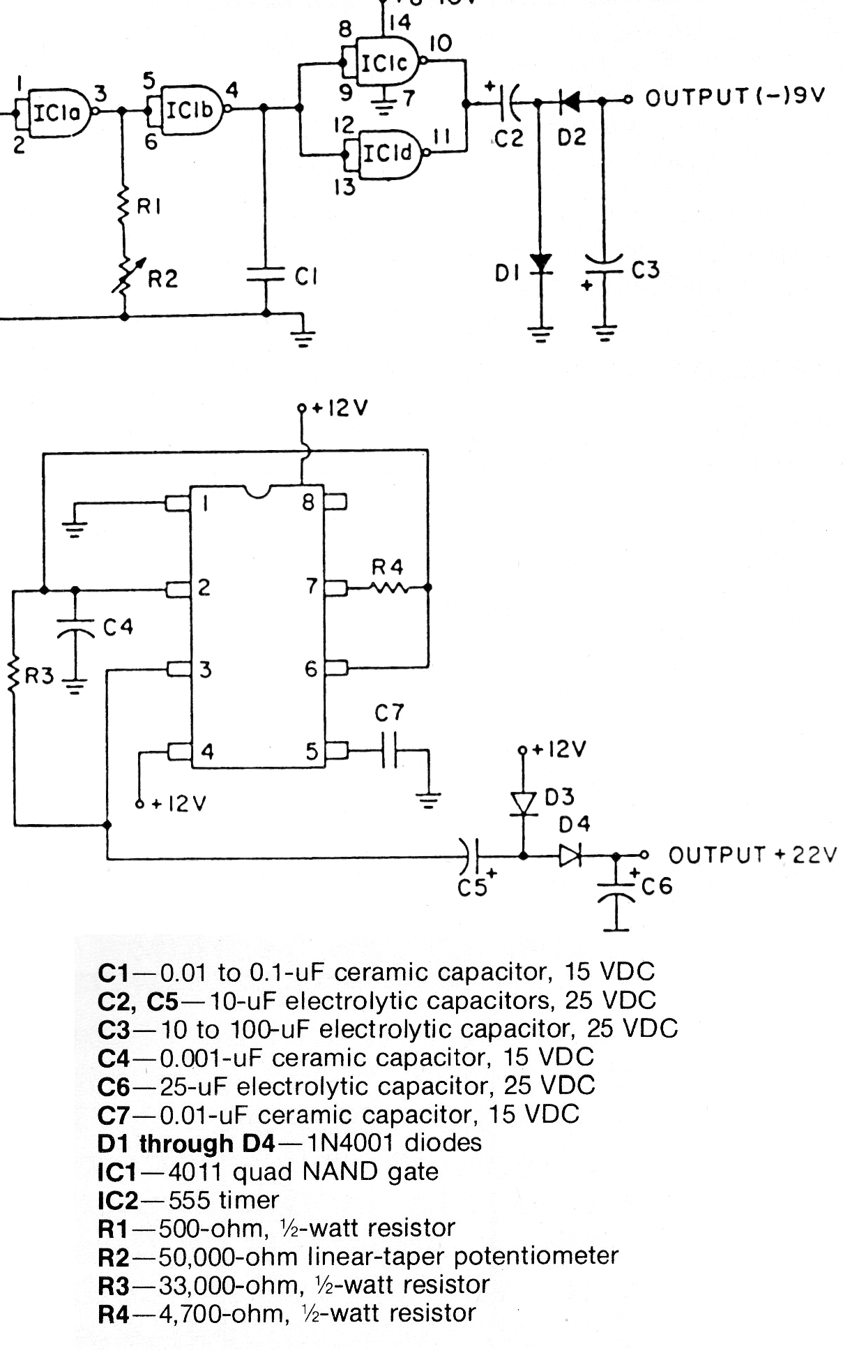 Este circuito fue obtenido en un Electronics Handbook de 1991. La publicación ya no existe, pero este circuito todavía puede ser montado, pues los circuitos integrados 4011 y 555 todavía son comunes. El circuito genera dos tensiones, siendo una positiva y una negativa, mayores que la tensión de entrada. La corriente es baja, sirviendo básicamente para la polarización.