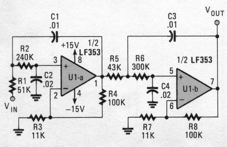 Este filtro, con una frecuencia de corte de aproximadamente 1 kHz tiene un Q elevado y emplea dos operativos. La fuente de alimentación debe ser simétrica.