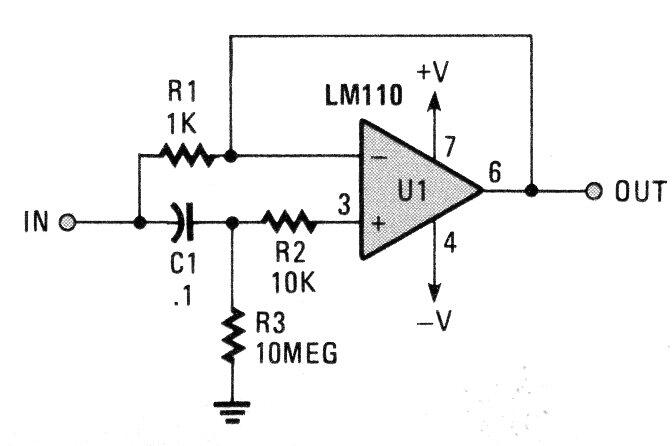 Este circuito simula el efecto de una inductancia. Se pueden utilizar amplificadores operacionales equivalentes y la fuente de alimentación debe ser simétrica. El circuito es de una Poptronics de la década de los 90.