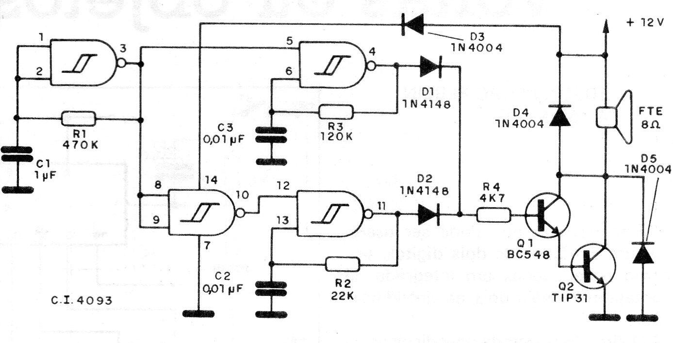Encontramos este circuito en una documentación de 1988, pero por los componentes usados todavía es actual. El circuito influye en una etapa de potencia, donde el transistor debe estar dotado de un buen disipador de calor. El efecto de sonido obtenido puede ser modificado por el cambio de los capacitores. La alimentación se realiza con 12 V y un fusible de protección de 2 A debe ser incluido en serie con la alimentación.