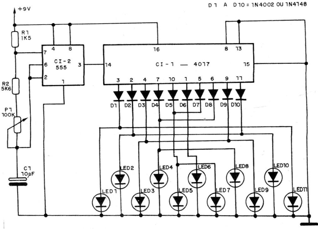 Este es un efecto de LED que encontramos en una documentación de 1988. El circuito acciona LED con un efecto especial de convergencia de los flujos de los LED. La velocidad se ajusta en P1 y el circuito puede ser alimentado por tensiones de 6 a 9 V.