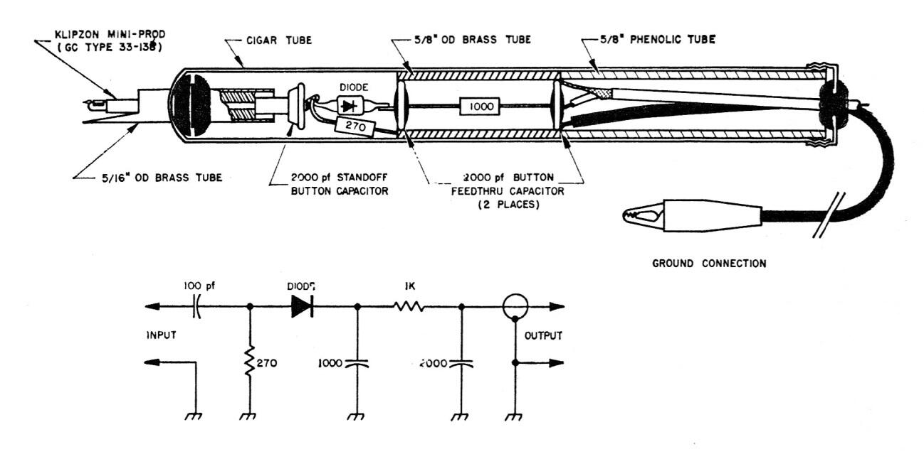 Este circuito se destina al uso con osciloscopios comunes habiendo sido encontrado en una documentación sobre instrumentación de los años 70. Los capacitores son del tipo cerámico con baja inductancia parásita.