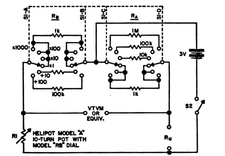 Esta es un puente pera a medida de resistencias de bajos valores y de altos valores. El circuito utiliza un multímetro común o microamperímetro como detector de nulo. En el caso del microamperímetro se debe calcular una resistencia en serie.