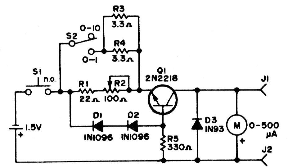 El circuito presentado consiste en una fuente de corriente constante que permite la lectura de resistencias en una escala de muy bajas resistencias. El circuito mide de 0 a 10 ohms y de 0 a 1 ohms en dos escalas. El transistor admite el equivalente.