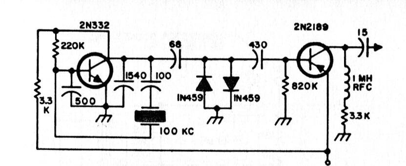Este circuito genera una señal precisa de 100 kHz. La señal es dada por un cristal y se puede utilizar para la calibración de diversos tipos de circuitos. Los transistores pueden ser tipos modernos como el BC548 o 2N2222. El circuito es de una antigua publicación estadounidense. La alimentación se puede realizar con tensiones de 9 a 15 V.