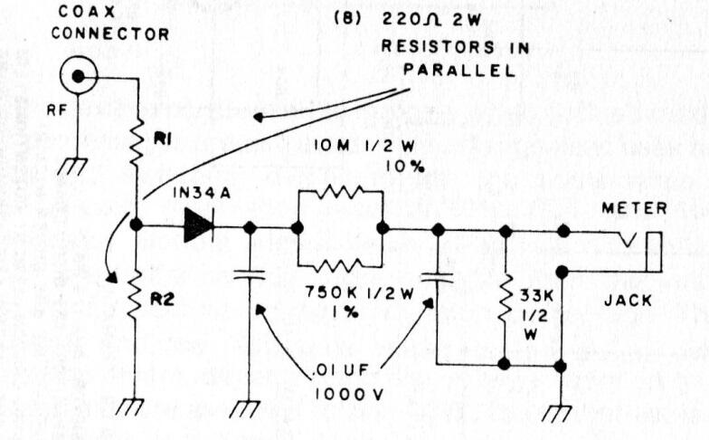 Los resistores R1 y R2 consisten en 8 resistores de 220 ohms x 2 W conectados en paralelo. La disipación debe ser mayor para potencias elevadas de transmisores. El indicador puede ser el multímetro.
