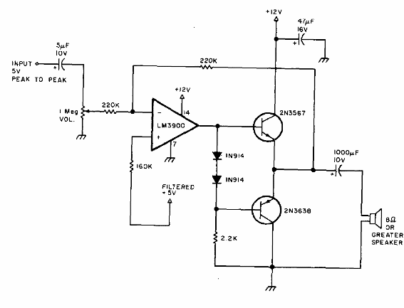 En la figura, de una documentación de los años 70, tenemos un amplificador de algunos watts para uso general. Los transistores de salida pueden ser los BD135 y BD136 dotados de disipadores y la fuente debe tener una tensión adicional de 5 V para polarización.