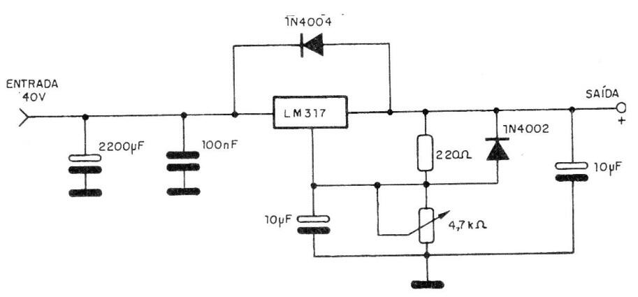 Una corriente de hasta 1,5 A puede ser obtenida con este circuito regulador, cuya tensión de salida será ajustada en la banda indicada por el potenciómetro de 4k7 ohmios. El capacitor de filtro en la entrada puede aumentarse para reducir más la ondulación. El circuito integrado debe montarse en un buen disipador de calor. Los condensadores deben tener tensiones de trabajo compatibles con la entrada y salida del regulador.