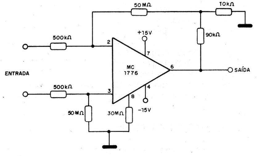El circuito presentado es sugerido por Motorola y consiste en un amplificador con impedancia muy alta de entrada. La ganancia de tensión es de 100 veces y es dada por la relación de valores entre el resistor de entrada y el resistor de realimentación. El resistor de entrada también determina la impedancia de entrada. La fuente de alimentación debe ser simétrica con la tensión indicada. La misma configuración se puede adaptar para su uso en otros amplificadores operacionales comunes.