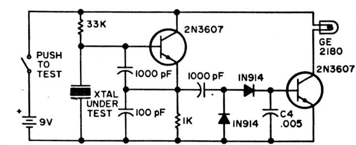 Este antiguo circuito de prueba de cristales utiliza una lámpara indicadora. En su lugar podemos usar un LED en serie con un resistor de 470 a 1 000 ohms.