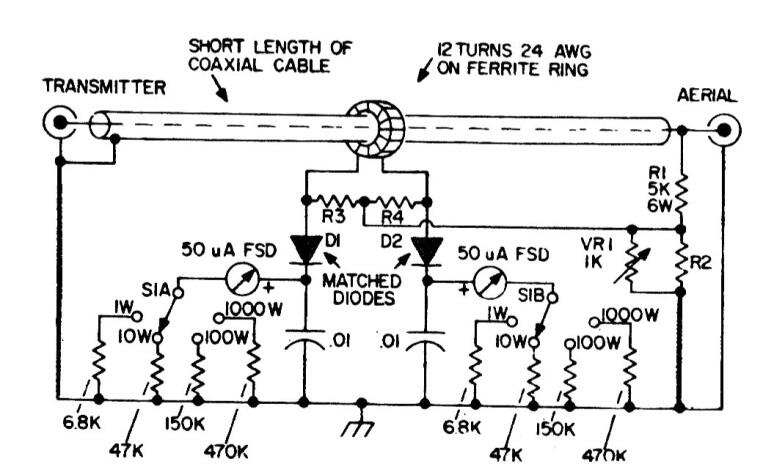 Este wattimetro para transmisores indica tanto la potencia directa como la reflejada, pudiendo funcionar con señales de 100 kHz a 70 MHz. El circuito es de una documentación para radioaficionados de los años 80.