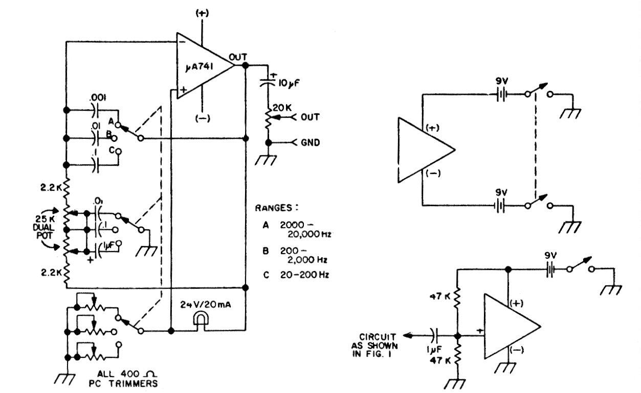 Este circuito de generador de audio de 20 a 20 000 Hz fue encontrado en una publicación americana de los años 80. La alimentación debe ser simétrica de 6 a 12 V y el circuito tiene tres bandas de ajustes. Se dan opciones de alimentación.