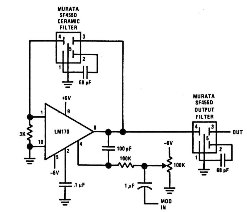 Este circuito es de un antiguo manual de componentes americano. El circuito integrado y los filtros cerámicos son pocos comunes actualmente, pero pueden ser investigados equivalentes. El funcionamiento debe ser alimentado por una fuente simétrica.