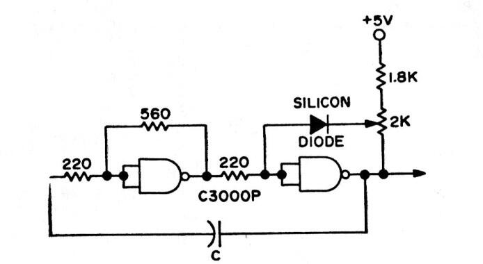 El circuito integrado utilizado en esta aplicación puede ser el 7400. La frecuencia depende de C que puede tener valores entre 1 nF y 10 uF típicamente. La señal es rectangular.