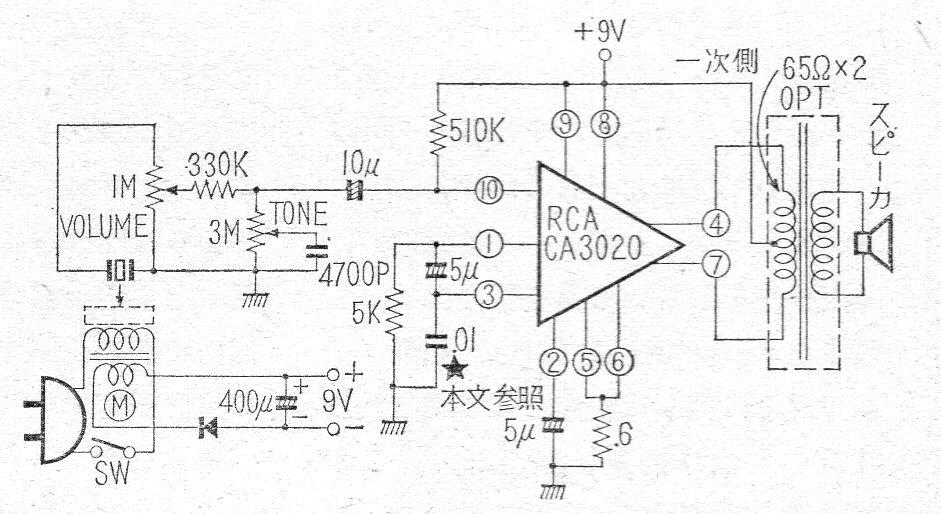 Este circuito es de 1968 consistente en un amplificador para tocadiscos de la época. El CA3020 fue uno de los primeros circuitos integrados comerciales que consistía en un amplificador de uso general todavía en cubierta metálica TO.
