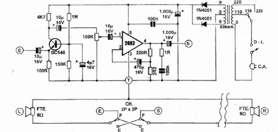 En realidad, el amplificador integrado utilizado en este circuito de los años 80 puede ser sustituido por un equivalente moderno. La línea de baja impedancia impide que se utilicen largos cables para la interconexión de las estaciones, como máximo unos 15 metros. El circuito incluye la fuente de alimentación.
