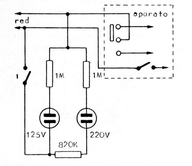 Este circuito simple hace uso de lámparas de neón para indicar la tensión de una red de energía. Las lámparas son de neón común y el circuito indica si la tensión es 110 V o 220 V.
