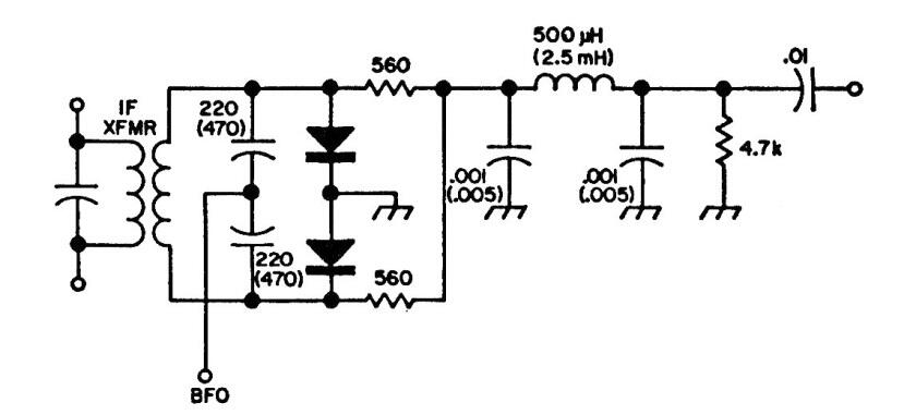 Este circuito se encontró en una documentación de la década de 1980 para radioaficionados. El circuito es para señales de 9 MHz y valores entre paréntesis para FI de 455 kHz. El circuito se puede adaptar a otras frecuencias.