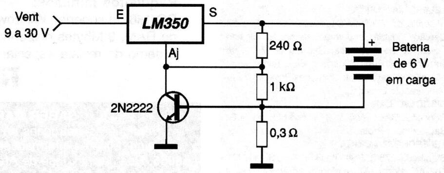 Este regulador de corriente para corrientes de hasta 3 A está diseñado para operar cómo un cargador de batería de 6 V. El circuito integrado debe tener un disipador de calor y la tensión de entrada debe estar en el rango de 9 a 30 V.