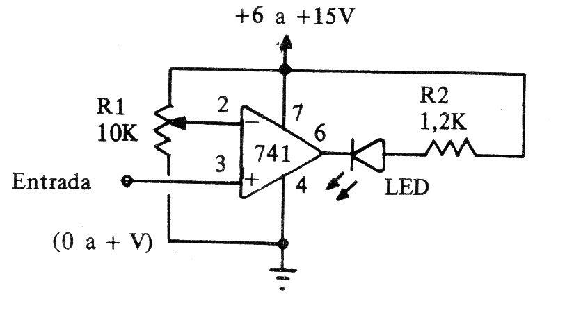 Este circuito activa un LED cuando la tensión alcanza el nivel establecido en R1. El circuito no necesita una fuente simétrica y se pueden utilizar otros operacionales. El resistor en serie con el LED determina su brillo.