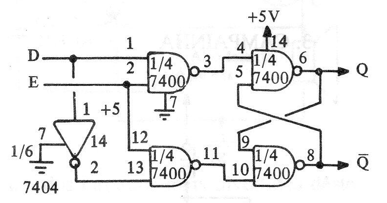 En la figura, mostramos cómo implementar un flip-flop tipo D utilizando el circuito integrado 7400 más una puerta 7404. El circuito debe alimentarse con 5 V y Q = D cuando E está en el nivel alto.