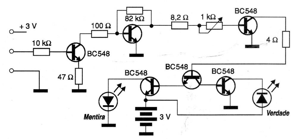 Los LED indicadores de este circuito pueden detectar variaciones menores en la resistencia de la piel de una persona que sostiene los electrodos. La energía es por dos baterías pequeñas y los LED son comunes de cualquier color.