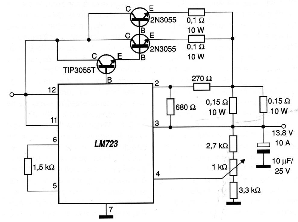 De hecho, es un regulador de 13.8 V x 10 A obtenido de una documentación de 2008. Los transistores 2N3055 deben montarse en excelentes disipadores de calor y el voltaje se ajusta en el trimpot. TIP3055 es la versión plástica de 2N3055.