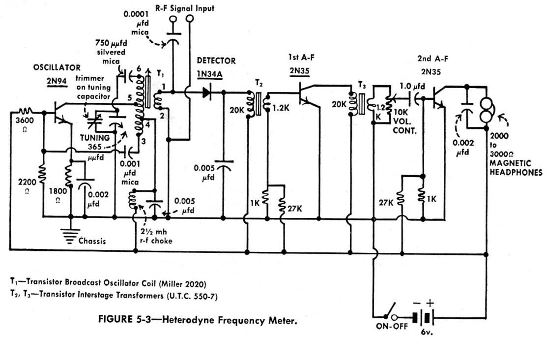 El principio de funcionamiento de este circuito de una publicación de 1956 es simple de entender. La señal de frecuencia desconocida se aplica al circuito y ajusta su oscilador hasta que alcanza el latido cero, que los auriculares detectan. Las bobinas determinan las frecuencias que se pueden medir. Los transformadores de audio son del tipo que se encuentra en las radios de transistores.