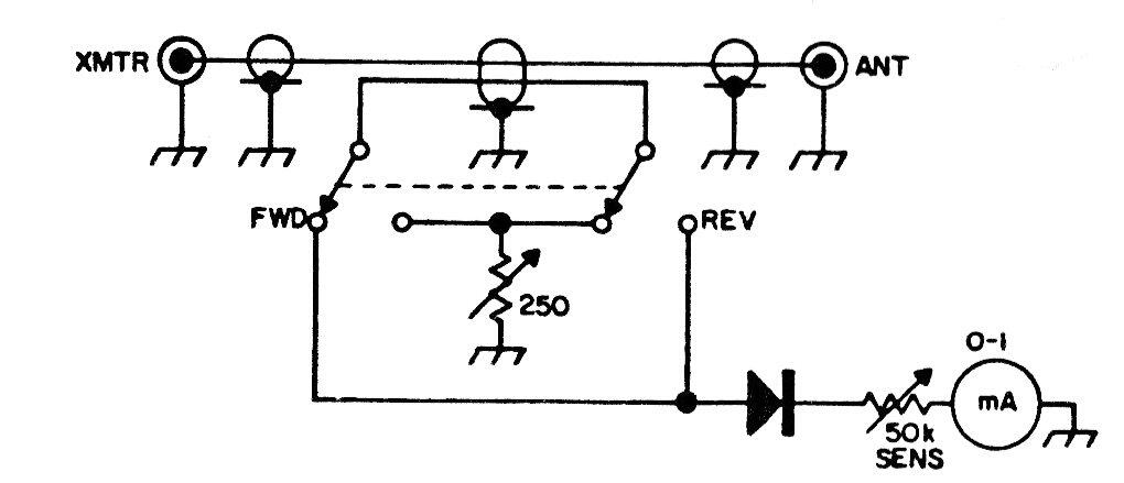 Este simple medidor de ondas estacionarias (ROE o WWR) se utiliza para ajustar la correspondencia de la antena con los transmisores. El diodo se usa comúnmente y el instrumento tiene escala completa de 1 mA. Lo encontramos en una vieja documentación de telecomunicaciones.