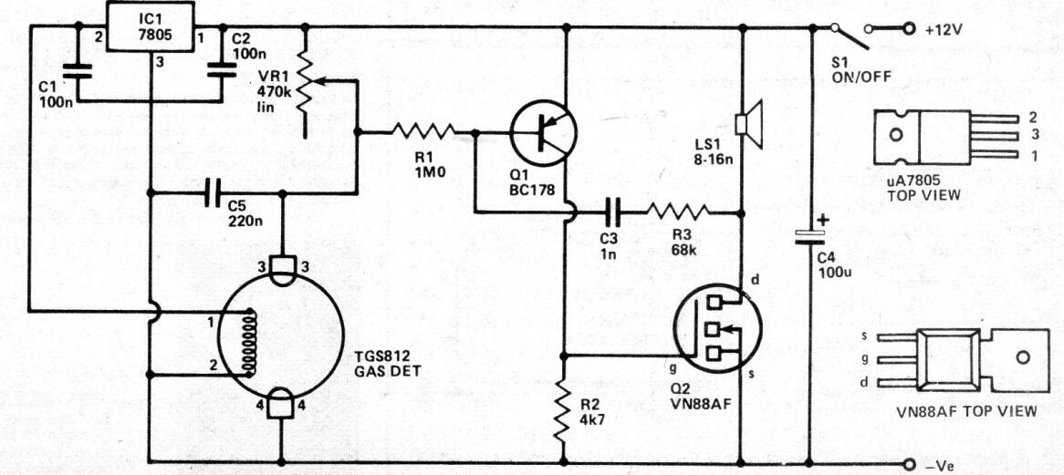 Este circuito es antiguo, de una publicación en inglés de 1979, por lo que el sensor indicado ya no se encuentra fácilmente. Los transistores aceptan equivalentes y la energía se suministra desde una fuente externa de 12 V.