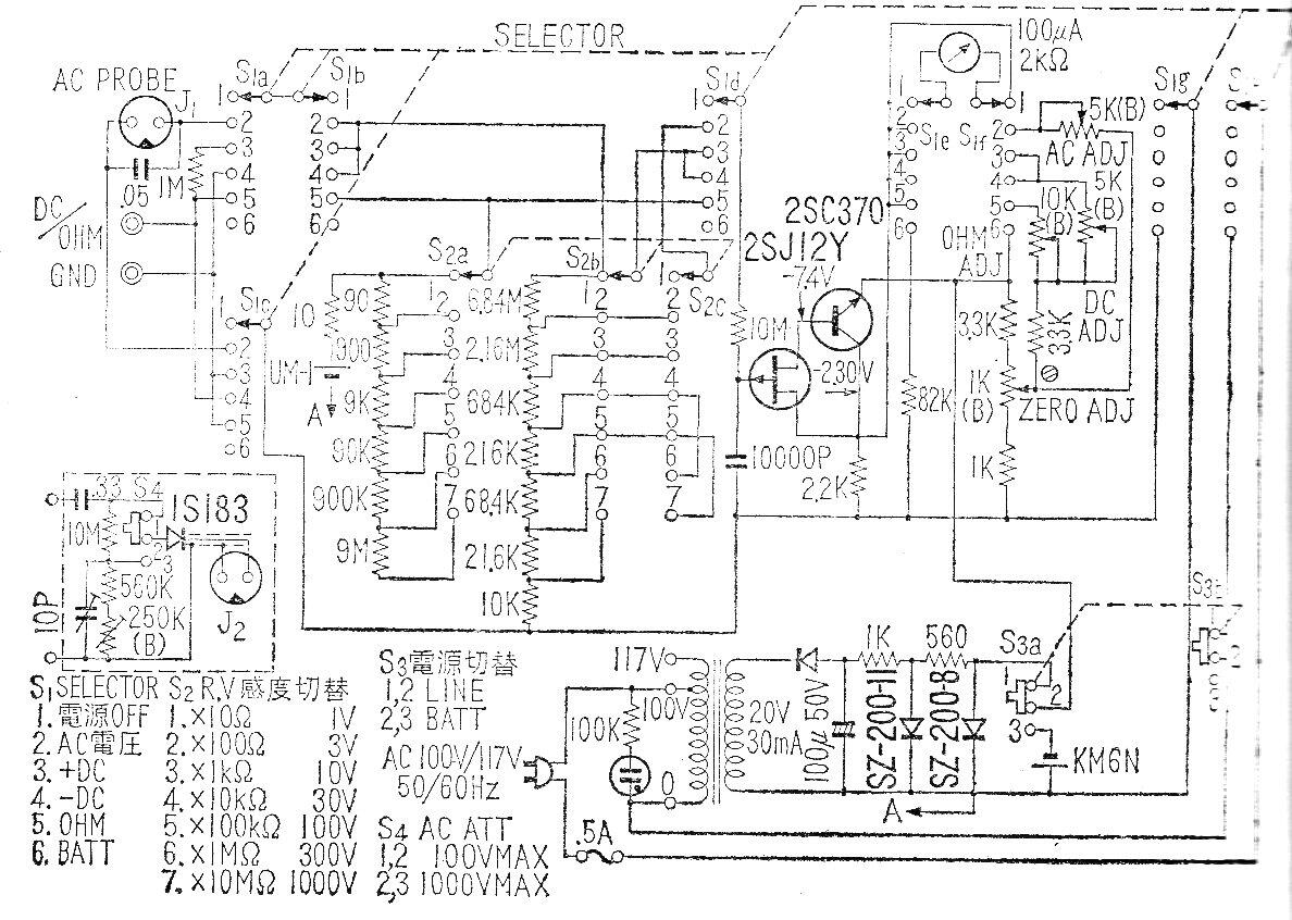 En la figura está el circuito comercial de un voltímetro electrónico japonés de los años 60. El circuito está completamente transistorizado, incluido un FET. La resistencia de entrada era muy alta y la energía suministrada por la red eléctrica.