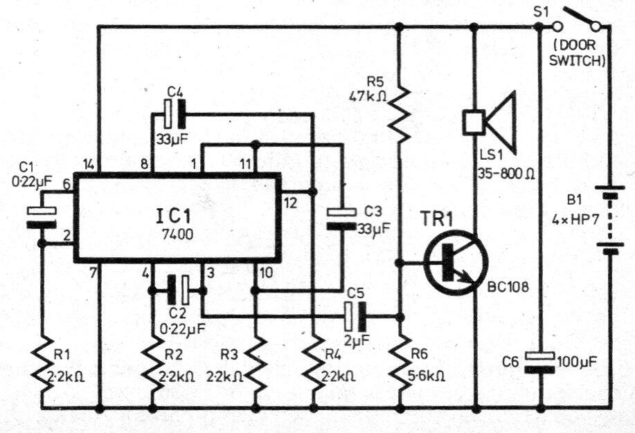 Este simple circuito oscilador TTL intermitente produce un tono cuando se dispara. El circuito debe estar alimentado por 5 V y el transistor amplificador puede ser un BC548 o un BD135. Los tonos dependen de los condensadores que se pueden cambiar.