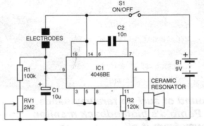 Este circuito se encontró en una documentación en inglés de la década de 1990. Utiliza un CMOS 4046 PLL y funciona con una batería de 9 V. Los sensores son dos electrodos que la persona debe sostener. El timbre es un transductor cerámico común.