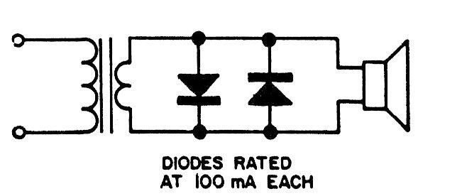 El propósito de este circuito con solo dos diodos es cortar los picos de ruido que aparecen en el altavoz. Los diodos pueden ser usados comúnmente o rectificadores si la señal es intensa. Lo encontramos en la documentación de los años ochenta.