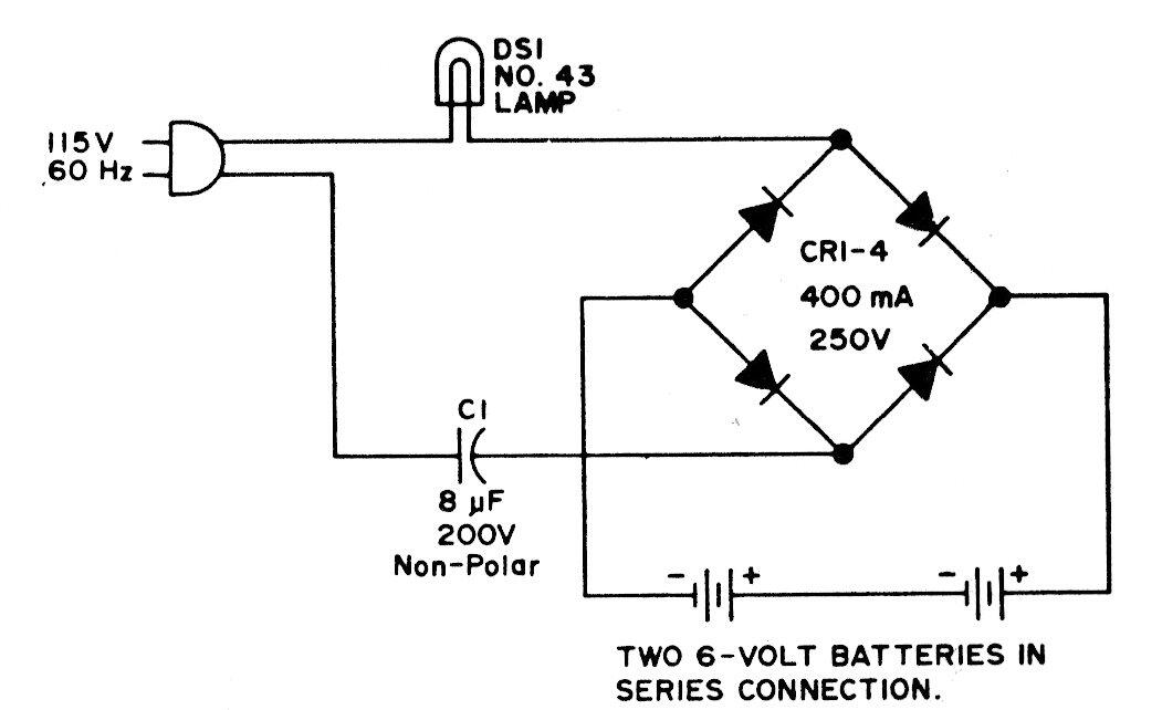 Encontramos este circuito de cargador para baterías Nicad o baterías en una vieja documentación estadounidense. Los diodos pueden ser 1N4004 y el condensador debe ser de poliéster a 400 V si la red es de 127 V. La lámpara puede ser una linterna de 12 volts.