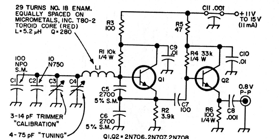Este circuito se encontró en una documentación antigua para radioaficionados, siendo indicado para transmisores en SSB. El circuito tiene los datos de la bobina en el diagrama mismo y se pueden usar transistores equivalentes modernos.