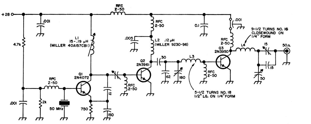 Este poderoso transmisor de 50 W se encontró en una publicación para operadores de radio aficionados en la década de 1980. El transistor de potencia Q3 es poco común en la actualidad y es el punto crítico para un posible ensamblaje. El circuito es para la banda de 50 MHz y requiere una fuente adecuada para la potencia requerida.
