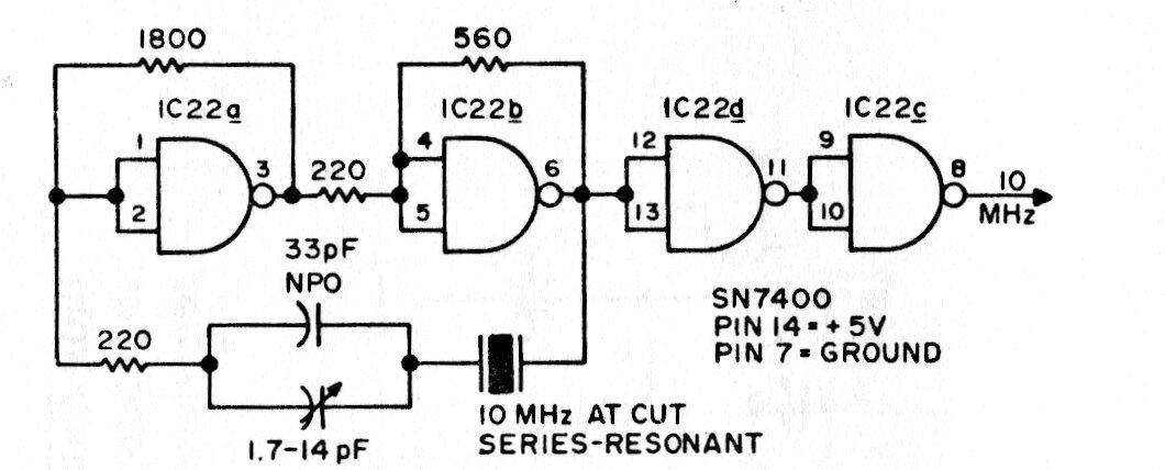 Encontramos este circuito en una documentación antigua del circuito. El TTL es el 7400 y la alimentación debe suministrarse con 5 volts. El circuito oscilará en otras frecuencias más bajas según el cristal utilizado.