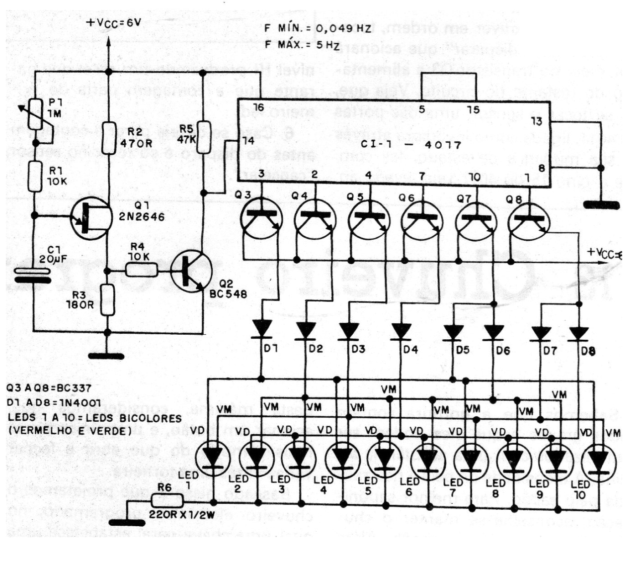 Este circuito de efectos de luz LED es de 1988, pero utiliza componentes que son comunes en la actualidad. Los LED están dispuestos en forma de tres triángulos con los efectos que tienen la velocidad controlada por el ajuste de P1. El circuito puede ser alimentado por baterías o fuente de alimentación.