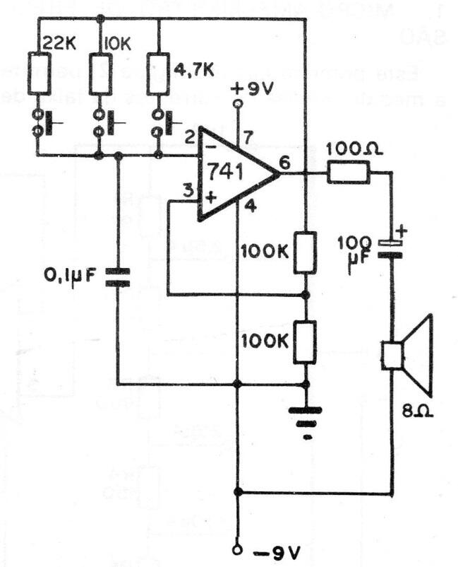 Este circuito se puede utilizar como una campanilla accionada desde 3 ubicaciones diferentes, lo que le permite identificar dónde fue. La fuente debe ser simétrica y puede consistir en dos juegos de baterías de 6 a 9 volts. La frecuencia viene dada por los resistores junto a los interruptores de presión.