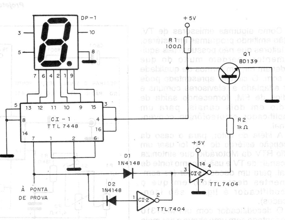 Encontramos este circuito de prueba TTL con indicador en la pantalla de 7 segmentos en una publicación de 1992. La potencia proviene del propio circuito que se está analizando. El display es de tipo cátodo común.
