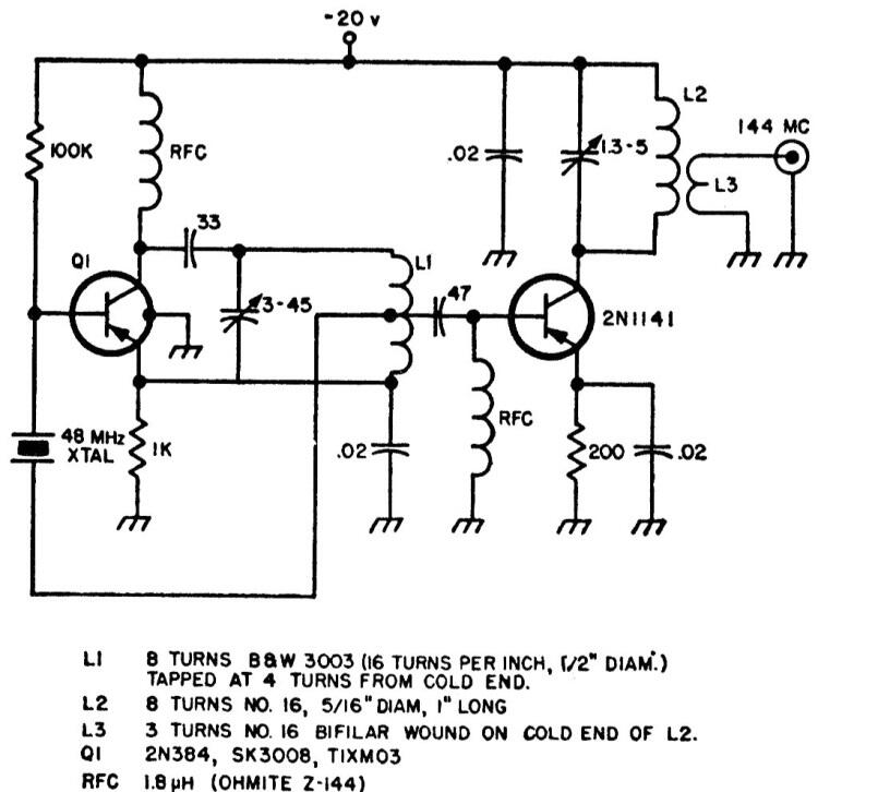 Este pequeño transmisor para el rango de 2 metros (144 MHz) es de una publicación estadounidense para amateurs. Junto al diagrama tenemos los datos de las bobinas. Los capacitores deben ser de cerámica.